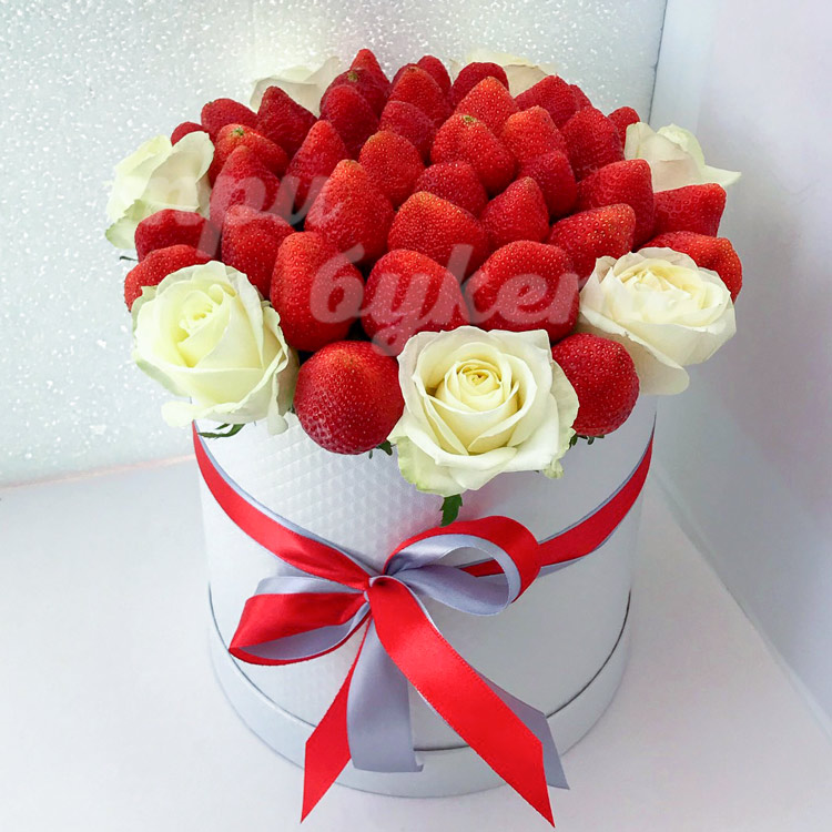 5 роз и клубника в коробке