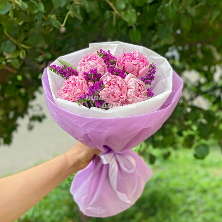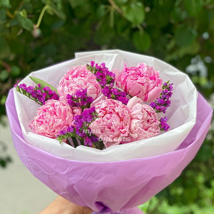 Букет 5 розовых пионов со статицей
