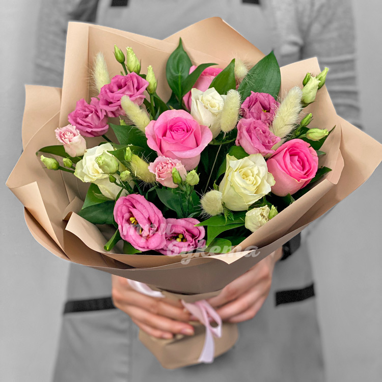 Букет из эустом, роз и лагуруса
