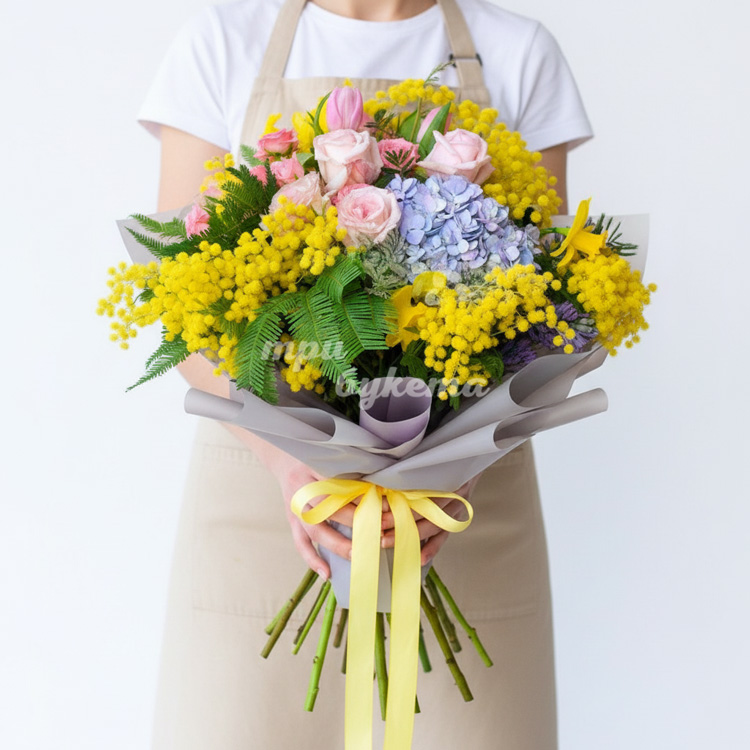 Букет из роз и мимоз на 8 марта