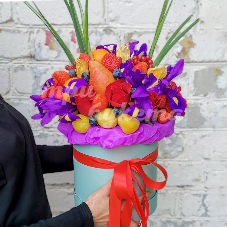 Фрукты и ирисы в шляпной коробке