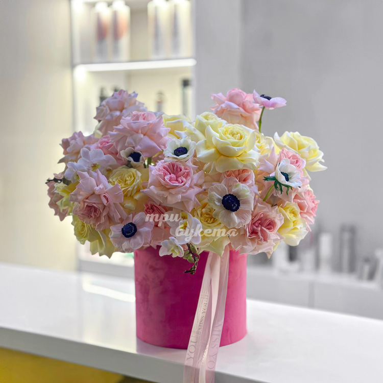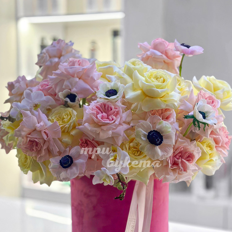Коробка французских роз, орхидей и анемонов