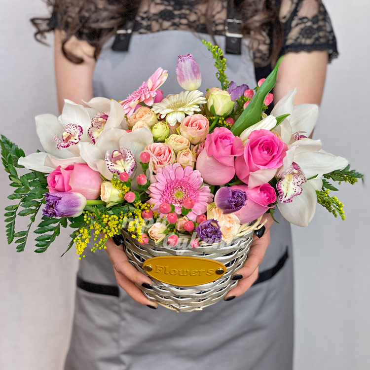 Корзина орхидей с тюльпанами