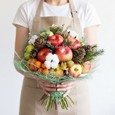 Корзина с белыми эустомами и фруктами