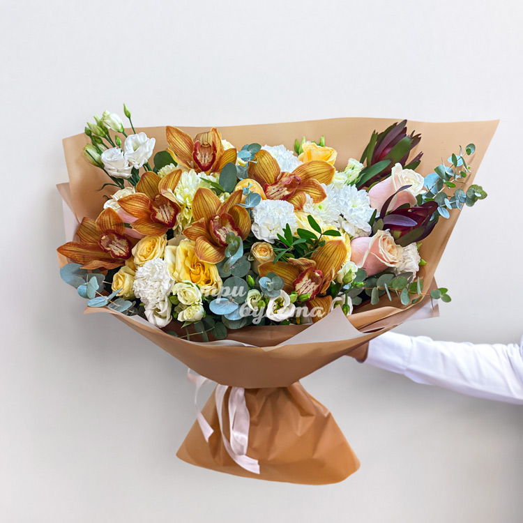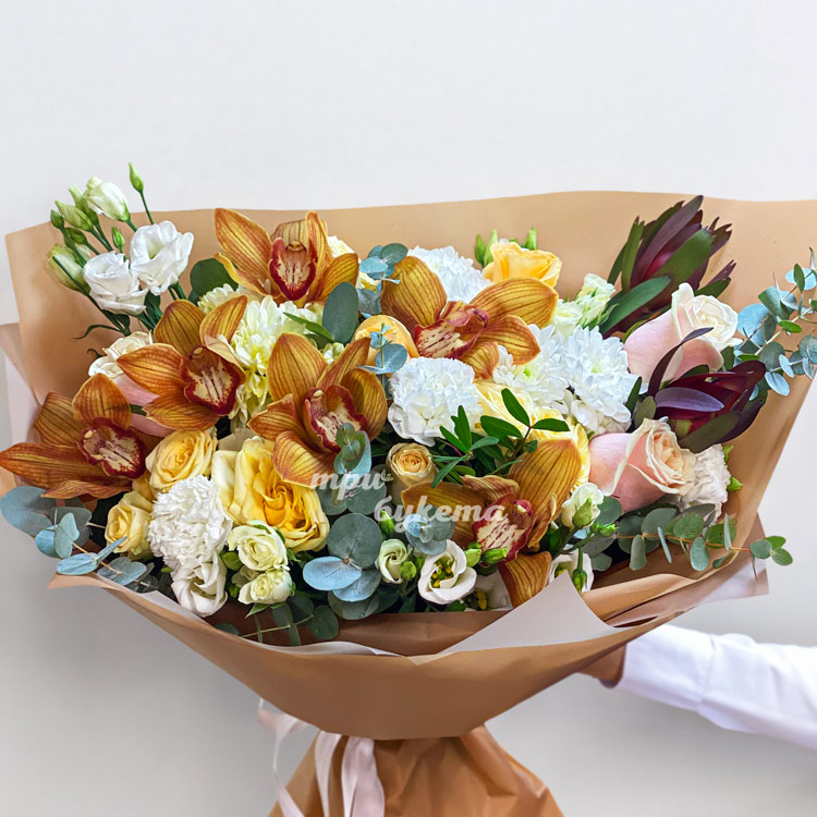 Оранжевый букет орхидей, роз и эустом