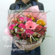 Пышный розовый букет роз и хризантем
