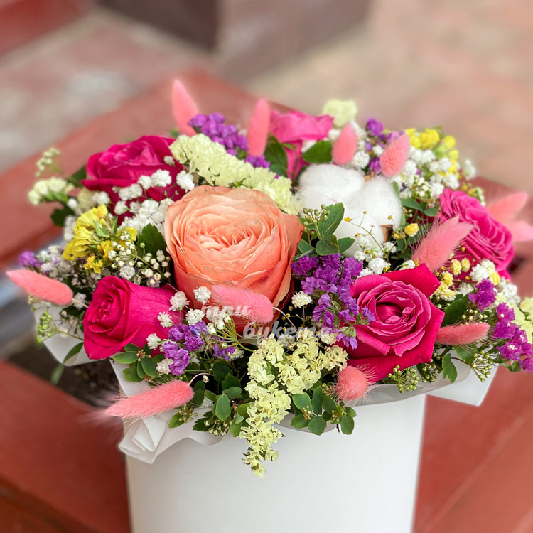 Яркая коробка с розами и статицей