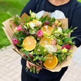 Яркая корзина гвоздик, роз и маттиол
